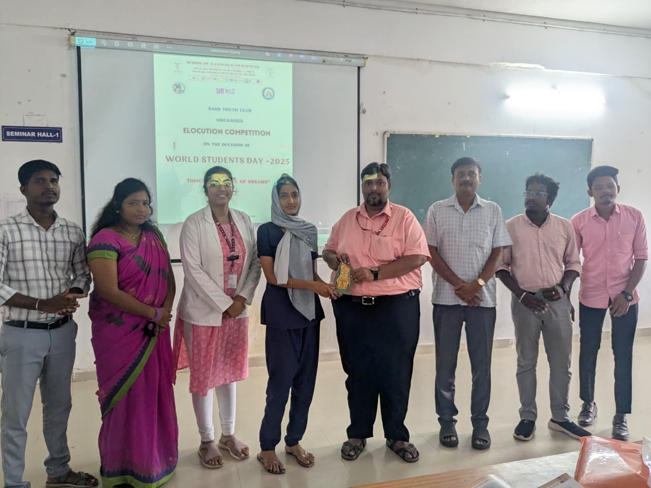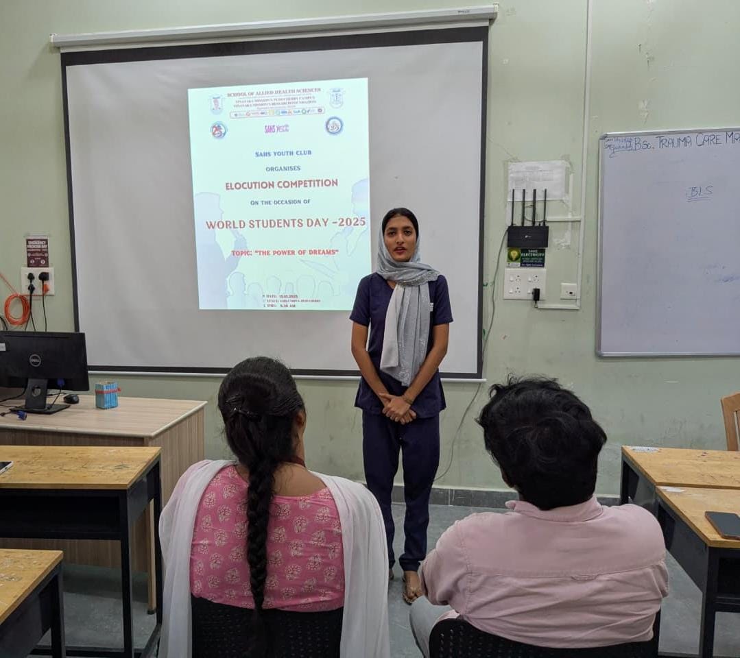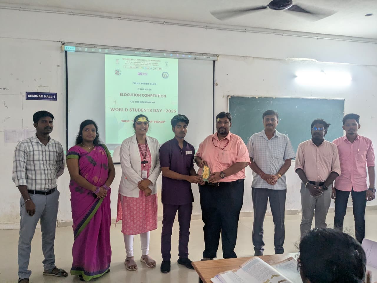 SAHS Youth Club, School of Allied Health Sciences, Puducherry organized Elocution Competition on the occasion of 'World Students Day-2025' on the topic 'The Power of Dreams' on 15th October 2025 in SAHS Campus, Puducherry. About 15 students participated in the competition.